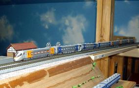 で、今週のかずまる特攻隊は何をしたのかというと、20日の26キロ走のあと、かずまるがハーゲンダッツのアイスクリームを食べたいと言うので、自転車で一緒に買いに行っただけであった。 ちなみに、写真は19日の昼休み中の光景、右側は近くS編成が3両から2両に減らされて7両編成になる8000系を鉄道模型で先に実現したものである。(2009.12.20) |